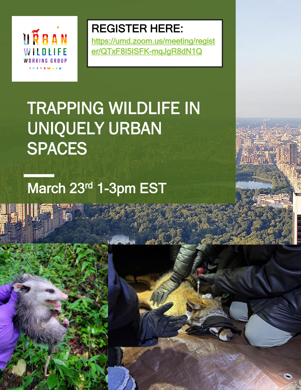 Please join us for a free 2-hour training focused on trapping wildlife in urban spaces on Monday, March 23rd, 2026 from 1-3 pm Eastern Time. In this workshop, you will hear from biologists with experience trapping wildlife in urban spaces to learn tips and tricks and best practices. Please register at: https://umd.zoom.us/meeting/register/QTxF8I5ISFK-mqJgR8dN1Q.